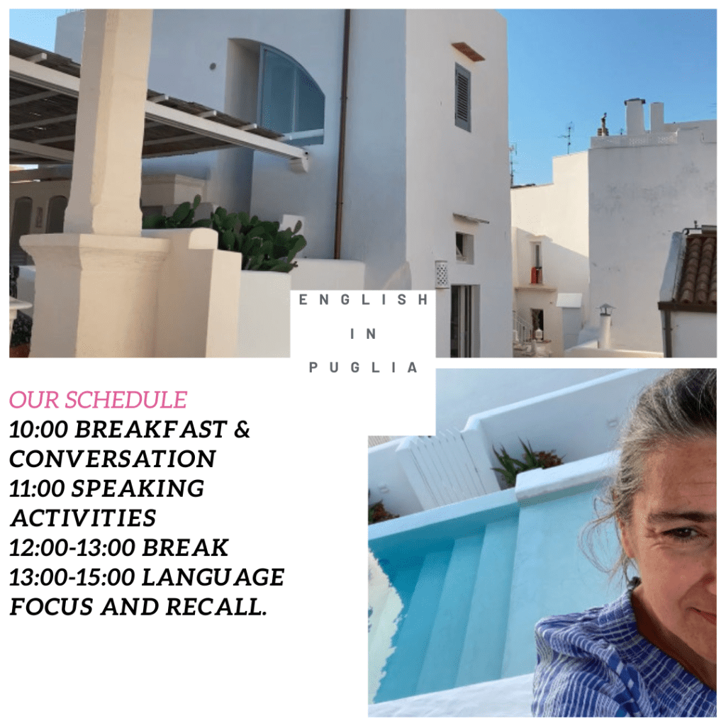 In Mancaversa, near Gallipoli, you will find an experienced English teacher who will speak English with you for four hours a day, for five days. This is an intensive, immersive English class for Intermediate speakers.